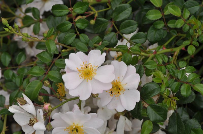 Suchen Sie nach einer wunderschönen bodendeckenden Rose für Ihren Garten? Die 'Medeo' Rose ist die perfekte Wahl! Mit ihrem flach niederliegenden Wuchs und den immer wiederkehrenden Blüten werden Sie sich immer wieder an ihrem Anblick erfreuen. Die weißen Blüten mit einem leichten rosa Überhauch und den gelben Staubgefäßen in der Mitte sind einfach bezaubernd. Pflanzen Sie sie an einem sonnigen bis halbschattigen Standort mit frischem und gut durchlässigem Boden. Holen Sie sich jetzt diese wunderbare Rose für Ihren Garten!