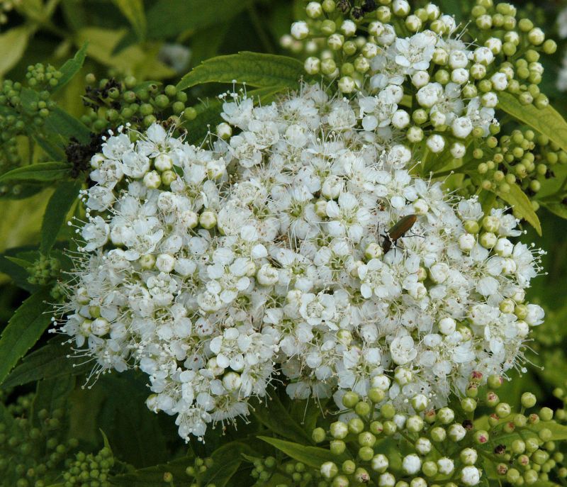 Ein schöner anspruchsloser Zwergstrauch, der auch mit schwierigen Böden zurecht kommt. Die weißen Blüten bildet er als Rispen den ganzen Sommer über. Die Japanspiere sollte im Frühjahr bis auf 10 cm zurückgeschnitten werden. Besonders gut geeignet für kleine Gärten, auf Balkon und Terrasse.